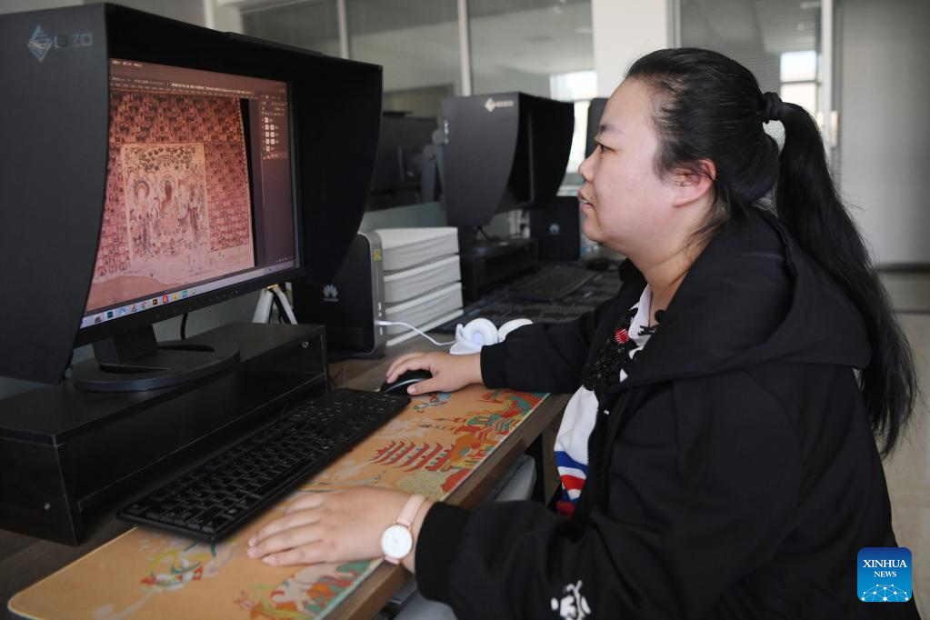 Nian Haili, a technician from the Dunhuang Academy's digital preservation team, processes images of a mural in Dunhuang, northwest China's Gansu Province, April 25, 2023. A group of young technicians have sought to use digital technology to ensure the permanent preservation and sustainable use of cultural relics in the Mogao Grottoes, a UNESCO World Heritage site in Dunhuang. (Xinhua/Fang Xin)