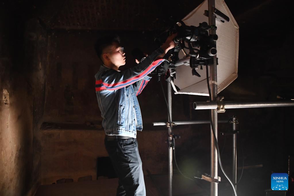 Xiong Yeteng, a technician from the Dunhuang Academy's digital preservation team, prepares to collect images of murals in a cave of the Mogao Grottoes in Dunhuang, northwest China's Gansu Province, April 25, 2023. A group of young technicians have sought to use digital technology to ensure the permanent preservation and sustainable use of cultural relics in the Mogao Grottoes, a UNESCO World Heritage site in Dunhuang. (Xinhua/Fang Xin)