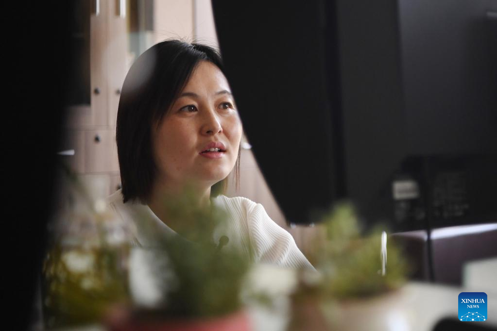 Han Xue, a member of the Dunhuang Academy's digital preservation team, looks up "Digital Dunhuang" website in Dunhuang, northwest China's Gansu Province, April 25, 2023. A group of young technicians have sought to use digital technology to ensure the permanent preservation and sustainable use of cultural relics in the Mogao Grottoes, a UNESCO World Heritage site in Dunhuang. (Xinhua/Chen Bin)