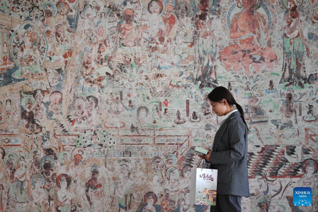 Liao Xueting, a marketer from the Dunhuang Academy's digital preservation team, walks past a high-fidelity replica of a mural in Dunhuang, northwest China's Gansu Province, April 25, 2023. A group of young technicians have sought to use digital technology to ensure the permanent preservation and sustainable use of cultural relics in the Mogao Grottoes, a UNESCO World Heritage site in Dunhuang. (Xinhua/Chen Bin)
