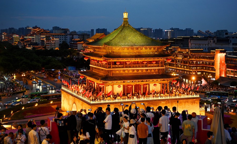 Tourists enjoy the night view of the ancient Bell Tower in Xi'an, capital of northwest China's Shaanxi Province, May 2, 2023. (Photo by Zou Jingyi/Xinhua)