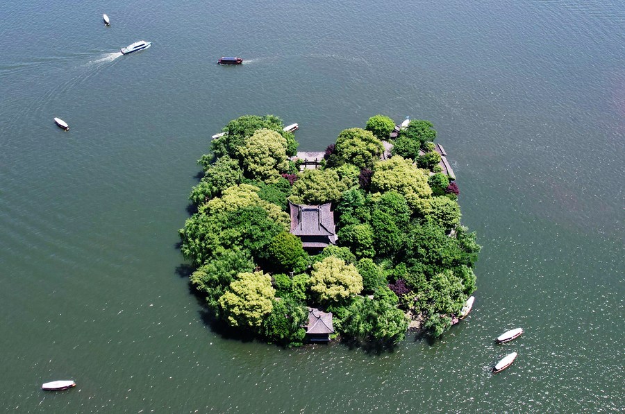 This aerial photo taken on May 1, 2023 shows tourists taking boats on the West Lake in Hangzhou, east China's Zhejiang Province. (Photo by Long Wei/Xinhua)