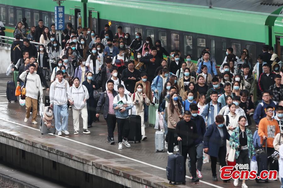 Passengers get off a train at Nanjing Railway Station in Nanjing, east China's Jiangsu Province, May 3, 2023. (Photo: China News Service/Yang Bo)