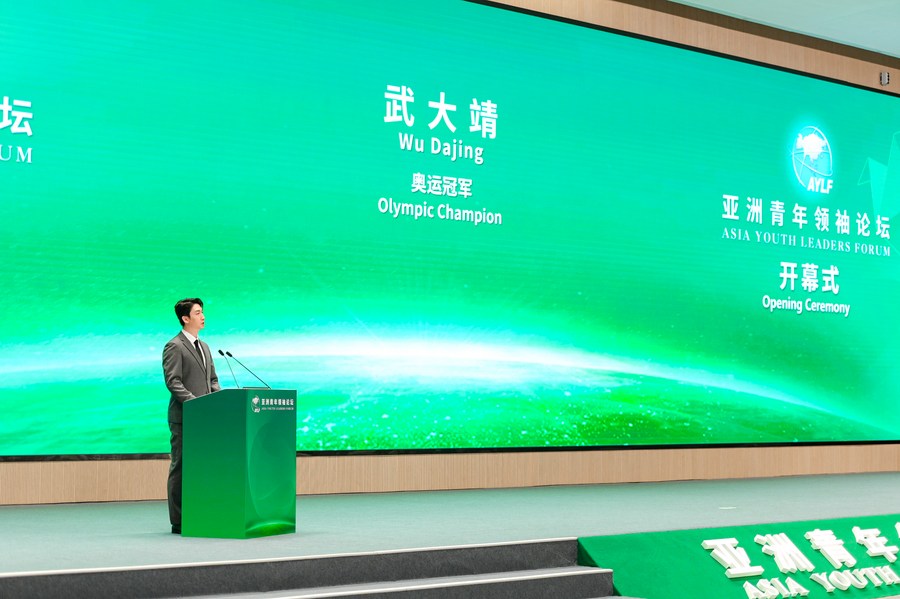 Chinese short-track skater and Winter Olympic medalist Wu Dajing delivers a speech during the opening ceremony of the Asia Youth Leaders Forum in Guangzhou, south China's Guangdong Province, March 25, 2023. (Xinhua)