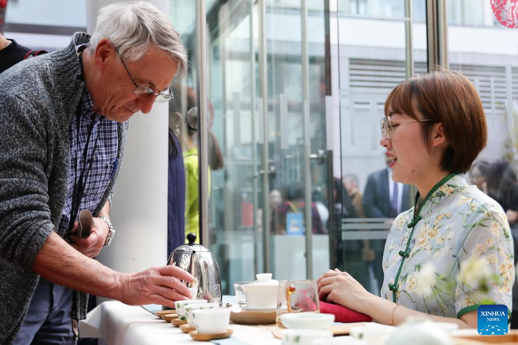 A visitor prepares to taste tea during an opening ceremony of Yaji Cultural Salon "Tea for Harmony" at China Cultural Center in Brussels, Belgium, on May 4, 2023. (Xinhua/Zheng Huansong)