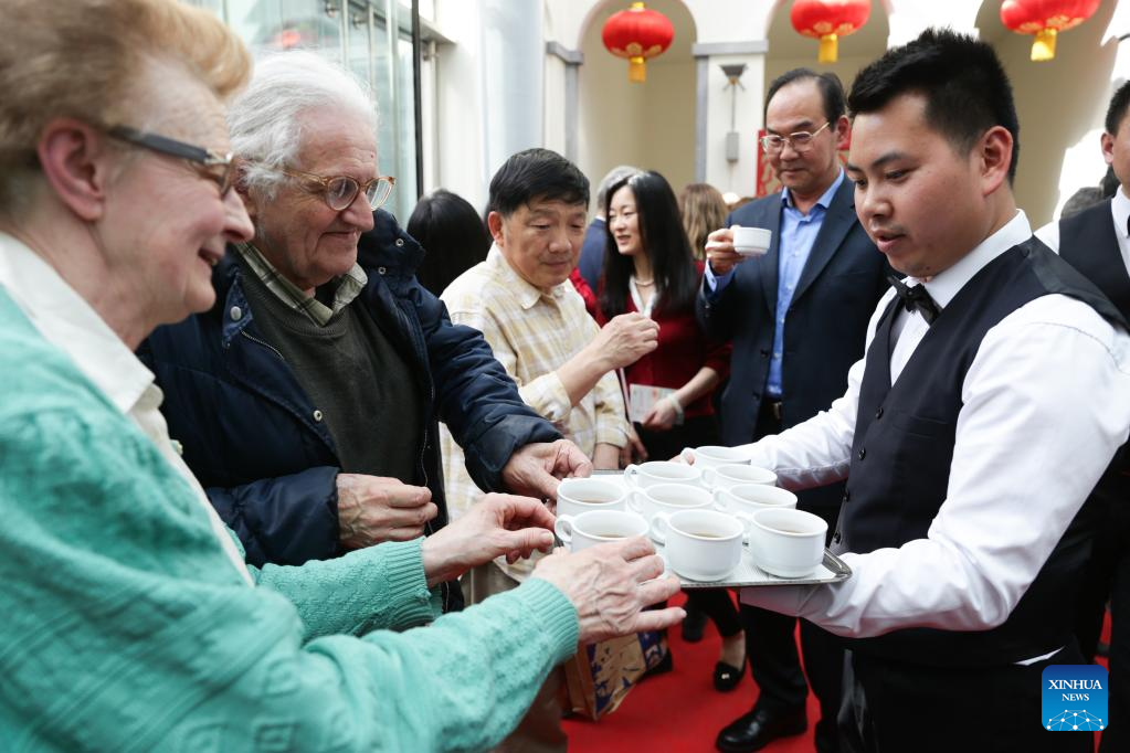 People taste tea during an opening ceremony of Yaji Cultural Salon "Tea for Harmony" at China Cultural Center in Brussels, Belgium, on May 4, 2023. (Xinhua/Zheng Huansong)