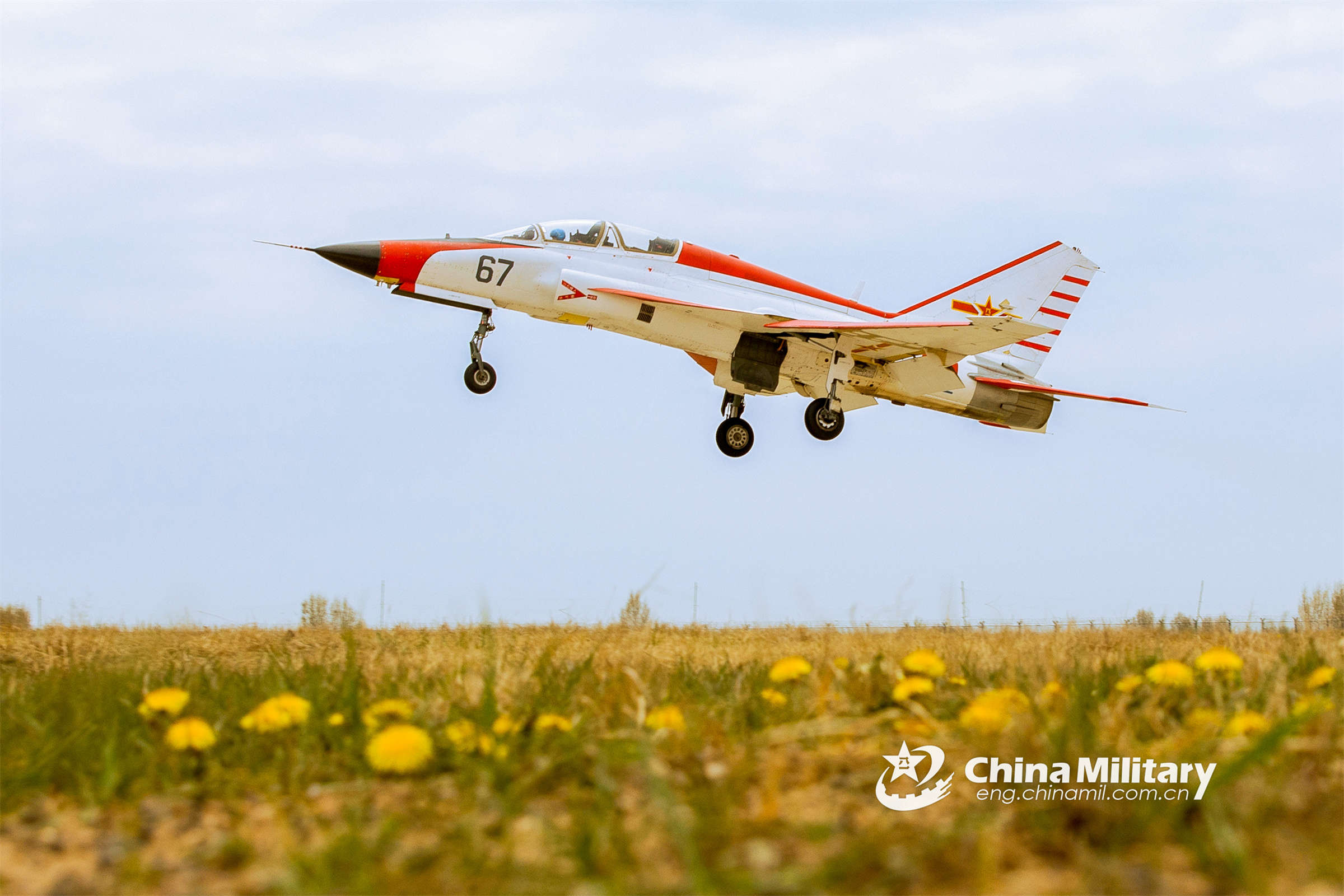 A jet trainer attached to a training regiment of the PLA Naval Aviation University takes off in an assessment on field carrier landing practice (FCLP) recently. (eng.chinamil.com.cn/Photo by Lan Pengfei)