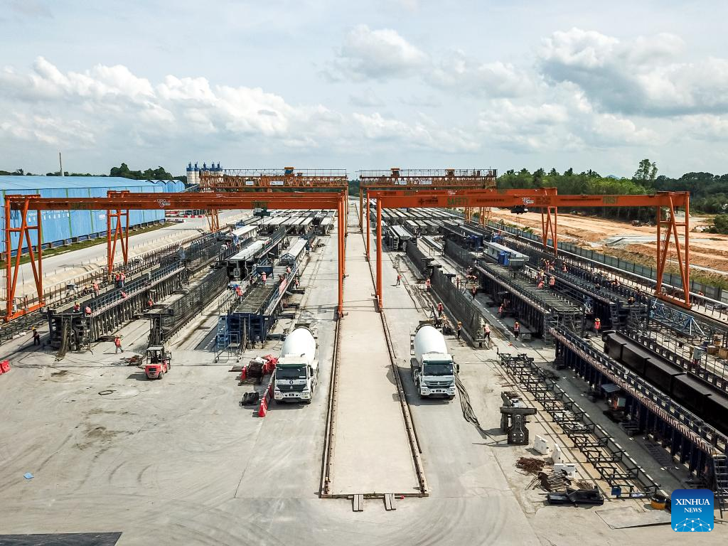 This aerial photo taken on April 26, 2023 shows a beam yard of the East Coast Rail Link (ECRL), a major infrastructure project under the Belt and Road Initiative (BRI) in Kelantan, Malaysia. (Xinhua/Zhu Wei)