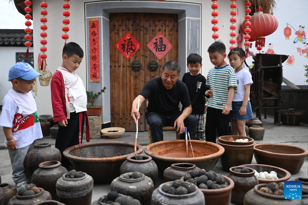 Villagers make traditional salted duck eggs at Dingshanhe Village, Tangqi Township, Linping District of Hangzhou, east China's Zhejiang Province, May 4, 2023. Villagers mark the upcoming "Lixia", or beginning of summer, by making various kinds of traditional food here. "Lixia" falls on May 6 this year. (Xinhua/Huang Zongzhi)