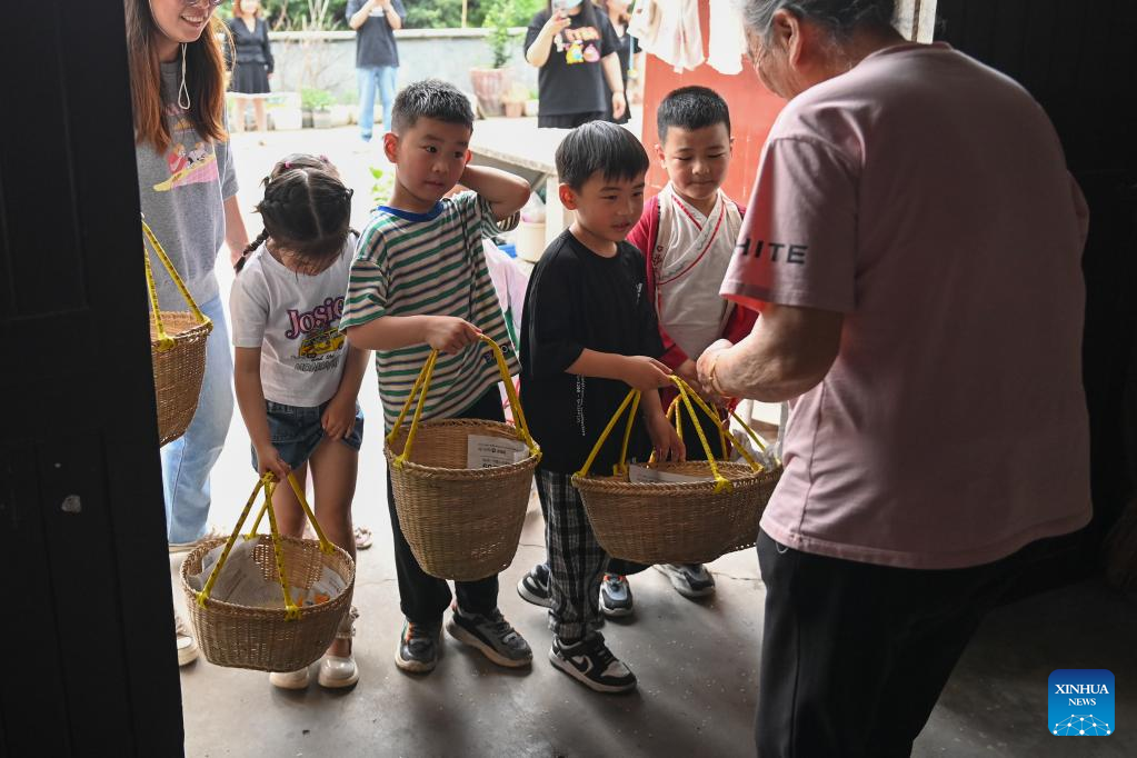 Children collect rice from neighbors to make meals at Dingshanhe Village, Tangqi Township, Linping District of Hangzhou, east China's Zhejiang Province, May 4, 2023. Villagers mark the upcoming "Lixia", or beginning of summer, by making various kinds of traditional food here. "Lixia" falls on May 6 this year. (Xinhua/Huang Zongzhi)