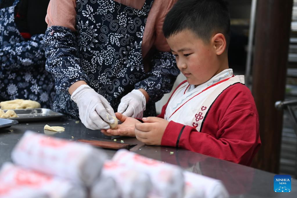 Children learn to make rice pastries at Dingshanhe Village, Tangqi Township, Linping District of Hangzhou, east China's Zhejiang Province, May 4, 2023. Villagers mark the upcoming "Lixia", or beginning of summer, by making various kinds of traditional food here. "Lixia" falls on May 6 this year.(Xinhua/Huang Zongzhi)