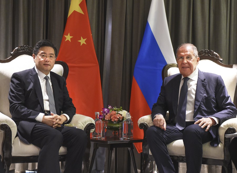 At a meeting with Russian Foreign Minister Sergei Lavrov Thursday on the sidelines of the SCO foreign ministers' meeting, Chinese State Councilor and Foreign Minister Qin Gang said that China is ready to join hands with Russia to implement the important consensuses reached between heads of state of the two countries and strengthen strategic communication.