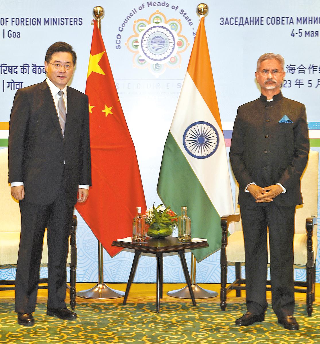 Chinese State Councilor and Foreign Minister Qin Gang (L) meets with Indian Foreign Minister Subrahmanyam Jaishankar on the sidelines of the Shanghai Cooperation Organization (SCO) foreign ministers' meeting in Goa, India, May 4, 2023. Javed Dar/Xinhua