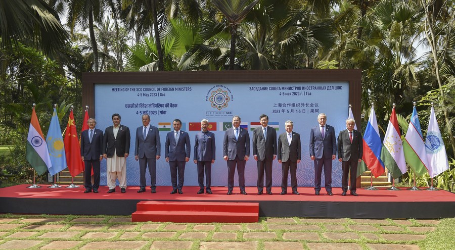 Chinese State Councilor and Foreign Minister Qin Gang (R4) attends the Shanghai Cooperation Organization (SCO) foreign ministers' meeting in Goa, India, May 5, 2023. (Xinhua/Javed Dar)