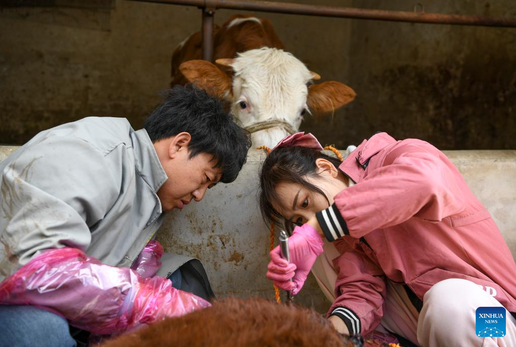 Veterinarian Bai Hua gives infusion to a cow owned by a farmer in Yuanzhou District, Guyuan, northwest China's Ningxia Hui Autonomous Region, April 17, 2023. (Xinhua/Feng Kaihua)