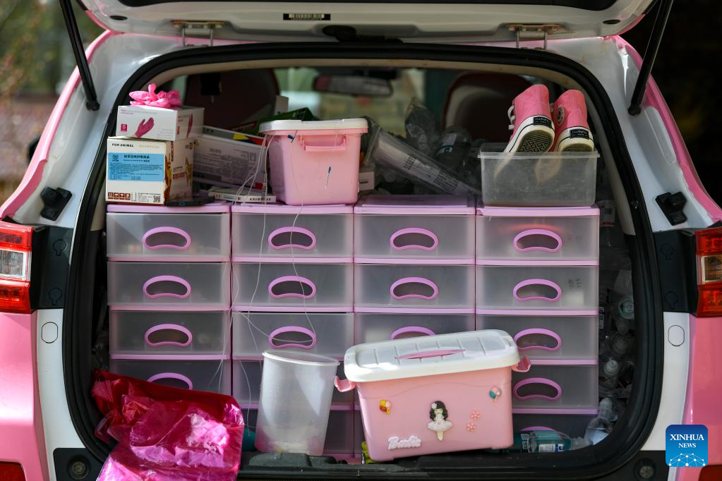 Veterinarian Bai Hua arranges medicines in the trunk of her car in front of her veterinary clinic in Yuanzhou District, Guyuan, northwest China's Ningxia Hui Autonomous Region, April 18, 2023. (Xinhua/Feng Kaihua)