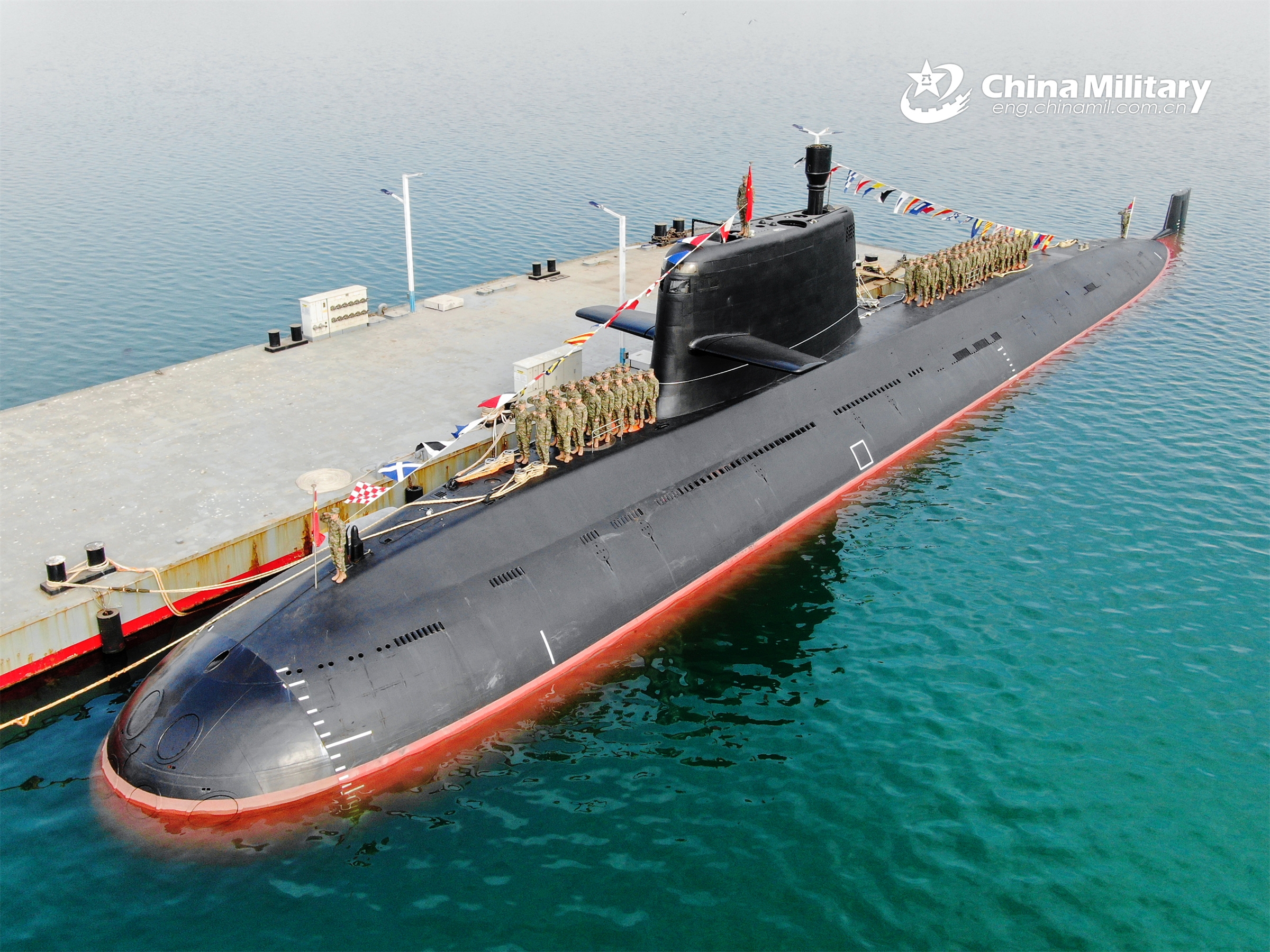 Sailors assigned to a submarine flotilla of the navy under the PLA Northern Theater Command hold a ceremony to celebrate the PLA Navy's 74th birthday in a military port on April 23, 2023. (eng.chinamil.com.cn/Photo by Wu Haodong)