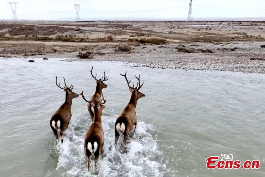 A herd of red deer cross the Buha River in Gangcha County of Haibei Tibetan Autonomous Prefecture, northwest China's Qinghai Province. (Photo/China News Service)