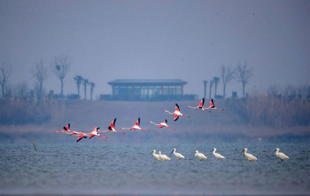 Birds fly over at the Tiaozini wetland, in Feb 2023. [Photo by Sun Jialu/for chinadaily.com.cn]
