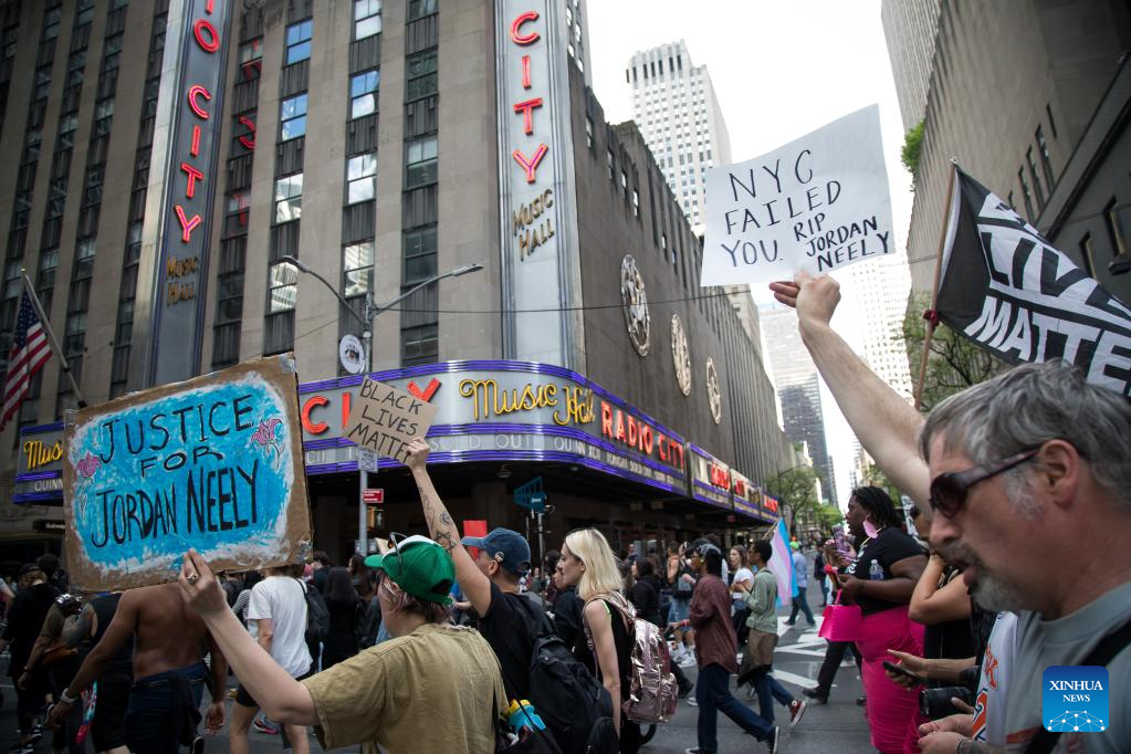 NEW YORK, May 6 (Xinhua) -- Demonstrations went on in New York City on Saturday, five days after 30-year-old black man Jordan Neely was allegedly choked to death by 24-year-old white U.S. marine veteran Daniel Penny on a subway in the city.