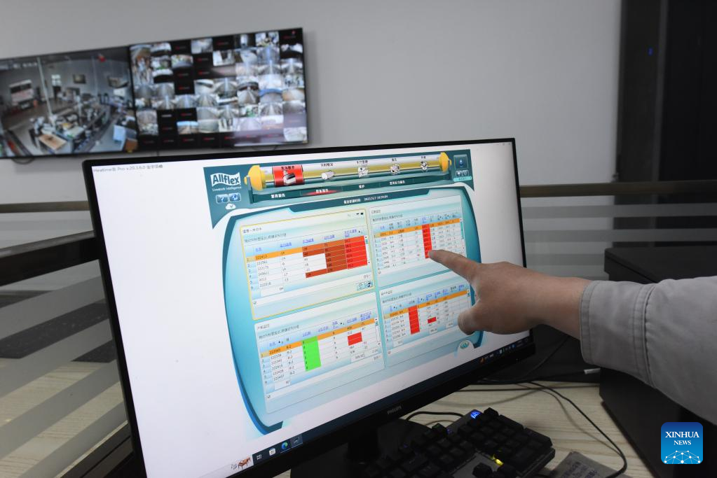 A staff member introduces a smart cow managing system at a dairy farm in Wuwei, northwest China's Gansu Province, May 7, 2023. (Xinhua/Ma Xiping)