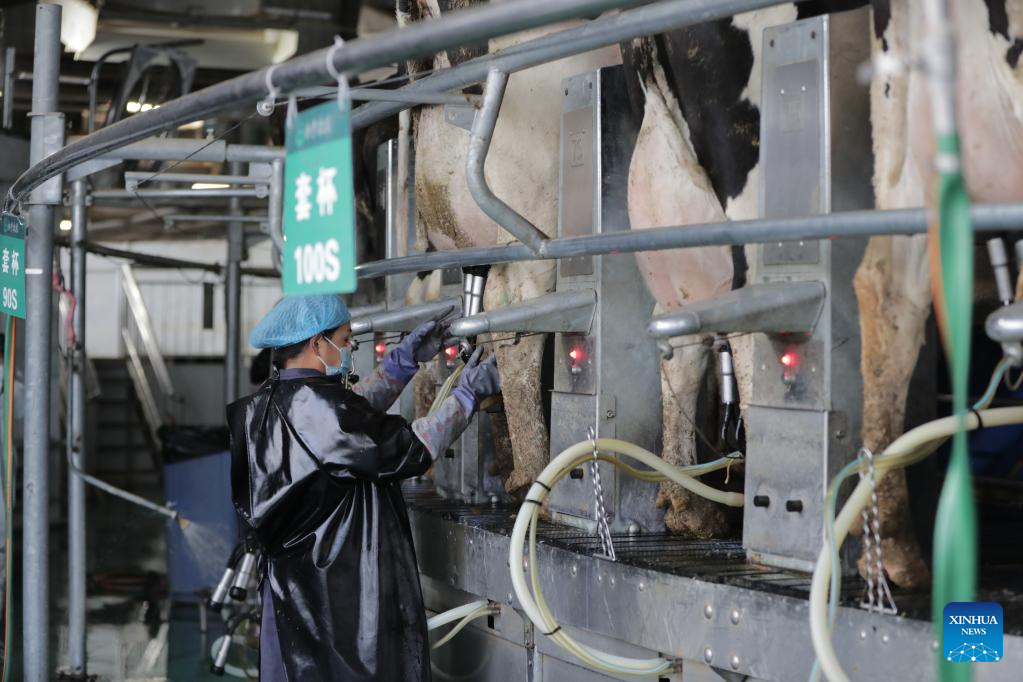 A staff member works beside a rotary milking machine at a dairy farm in Wuwei, northwest China's Gansu Province, May 7, 2023. (Xinhua/Ma Xiping)