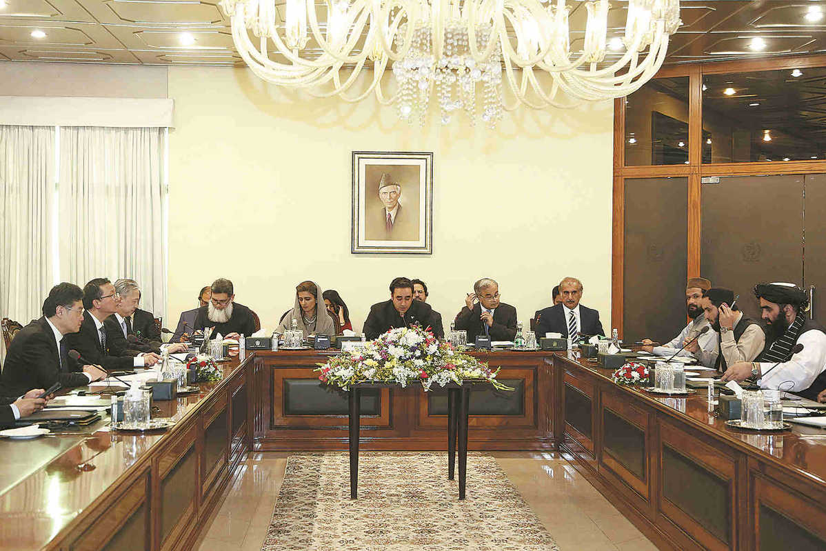 Chinese State Councilor and Foreign Minister Qin Gang (left) attends the fifth China-Afghanistan-Pakistan Foreign Ministers' Dialogue in Islamabad, the Pakistani capital, on Saturday. XINHUA