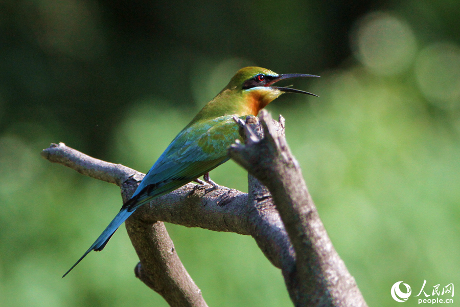 A blue-tailed bee-eater chirps on a dead branch in a nature reserve in Xiamen, southeast China's Fujian Province. (People's Daily Online/Chen Bo)