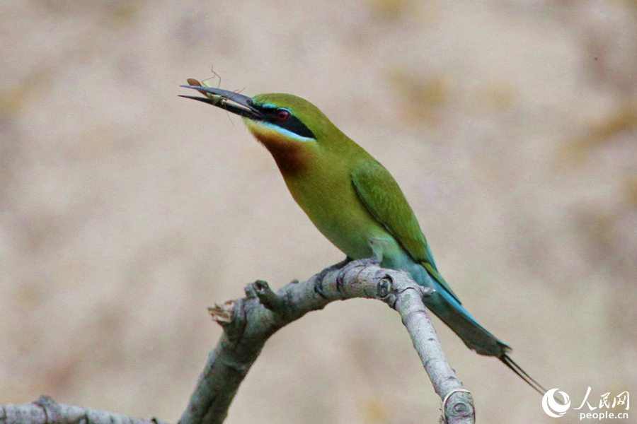A blue-tailed bee-eater eats an insect in a nature reserve in Xiamen, southeast China's Fujian Province. (People's Daily Online/Chen Bo)