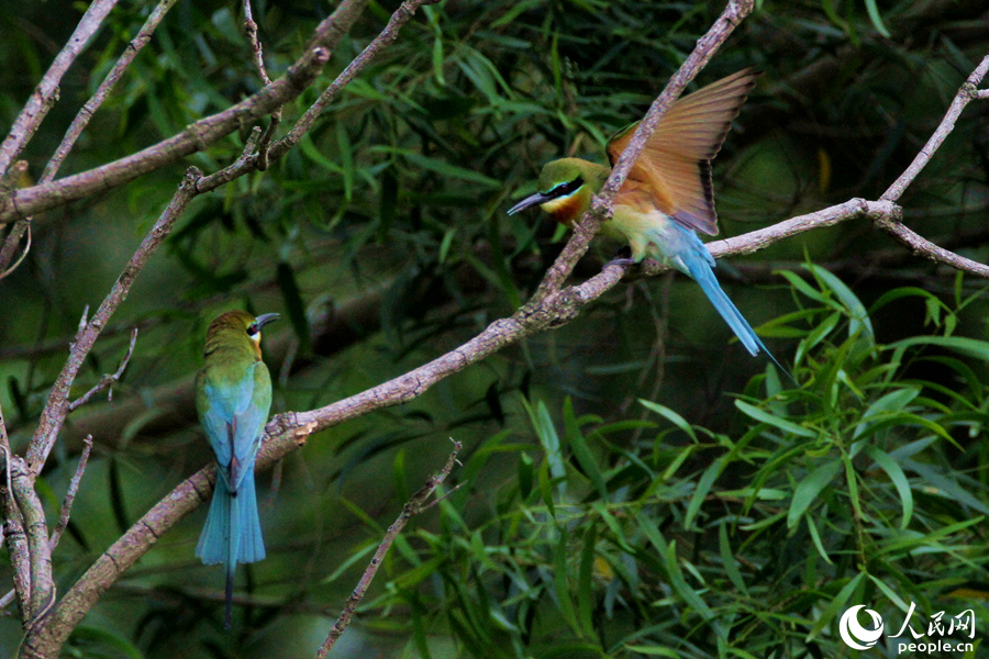 Blue-tailed bee-eaters play in a nature reserve in Xiamen, southeast China's Fujian Province. (People's Daily Online/Chen Bo)