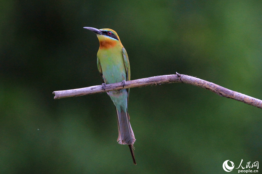 Photo shows a blue-tailed bee-eater perching on a tree branch in a nature reserve in Xiamen, southeast China's Fujian Province. (People's Daily Online/Chen Bo)