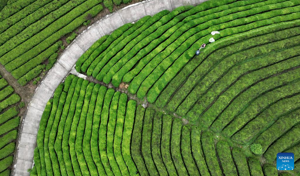 This aerial photo taken on May 7, 2023 shows villagers picking tea leaves at a tea garden in Zouma Township, Hefeng County, central China's Hubei Province. In recent years, Hefeng County has explored the integration of tea industry with tourism and built a number of tea gardens, which help increase local farmers' income and promote rural revitalization. (Photo by Yang Shunpi/Xinhua)