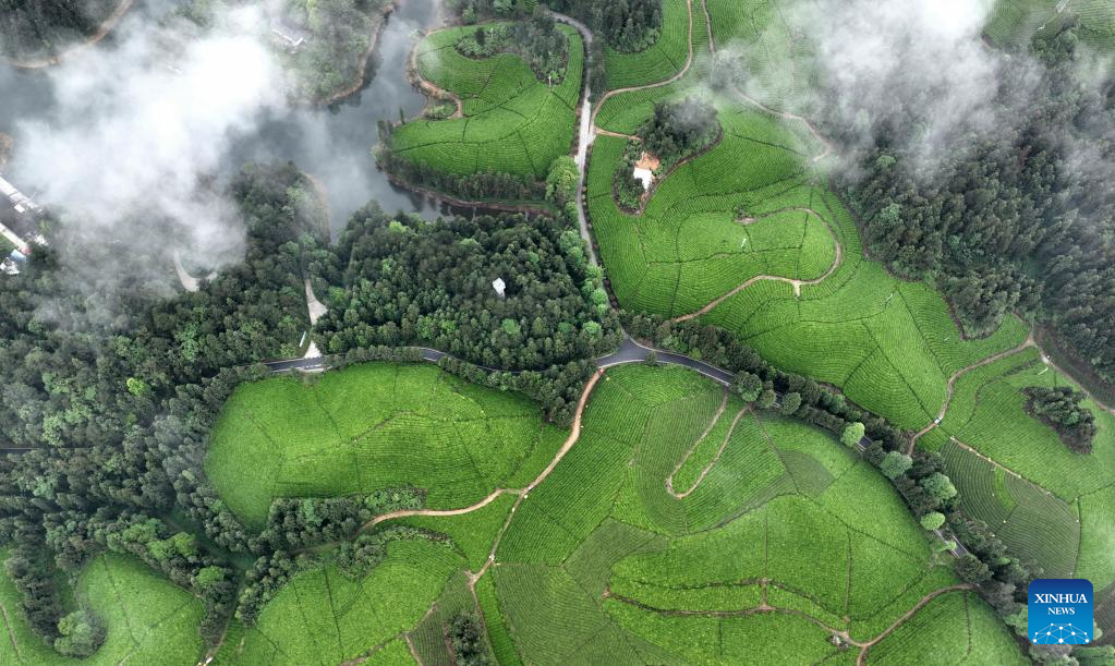 This aerial photo taken on May 8, 2023 shows a tea garden in Zouma Township, Hefeng County, central China's Hubei Province. In recent years, Hefeng County has explored the integration of tea industry with tourism and built a number of tea gardens, which help increase local farmers' income and promote rural revitalization. (Photo by Yang Shunpi/Xinhua)