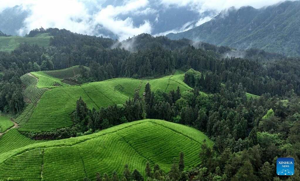 This aerial photo taken on May 7, 2023 shows a tea garden in Zouma Township, Hefeng County, central China's Hubei Province. In recent years, Hefeng County has explored the integration of tea industry with tourism and built a number of tea gardens, which help increase local farmers' income and promote rural revitalization. (Photo by Yang Shunpi/Xinhua)