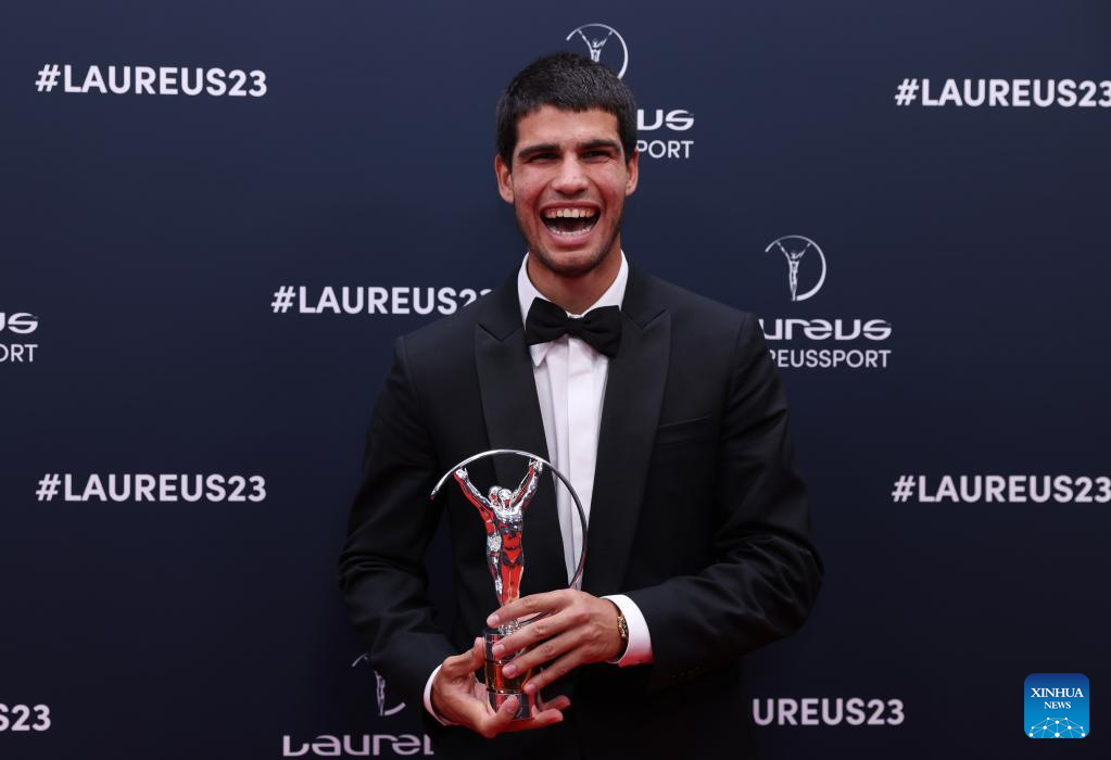 Laureus World Breakthrough of the Year award winner, Spanish tennis player Carlos Alcaraz poses with the trophy at the 2023 Laureus World Sports Awards ceremony in Paris, France, May 8, 2023. (Xinhua/Gao Jing)