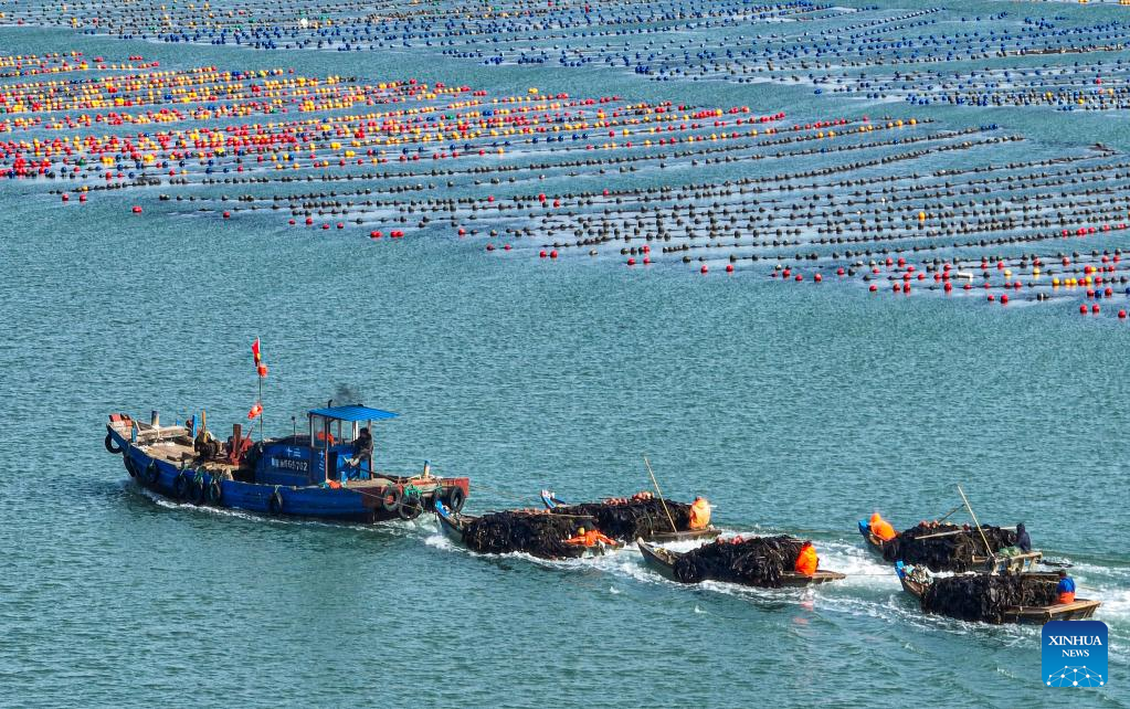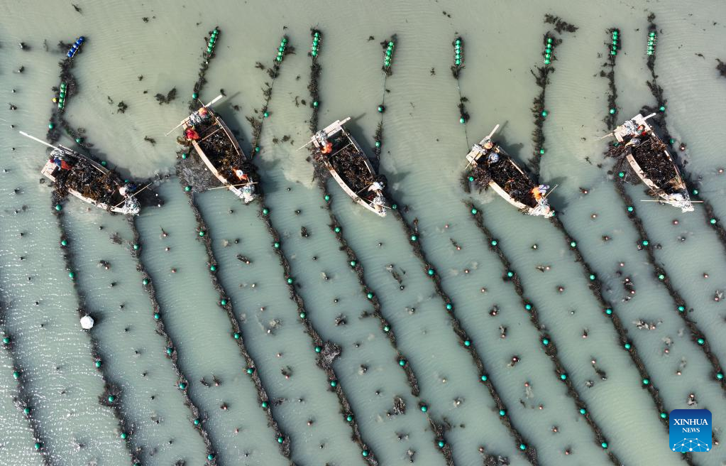 This aerial photo shows fishermen harvesting kelp in Rongcheng, east China's Shandong Province, May 8, 2023. (Photo by Li Xinjun/Xinhua)