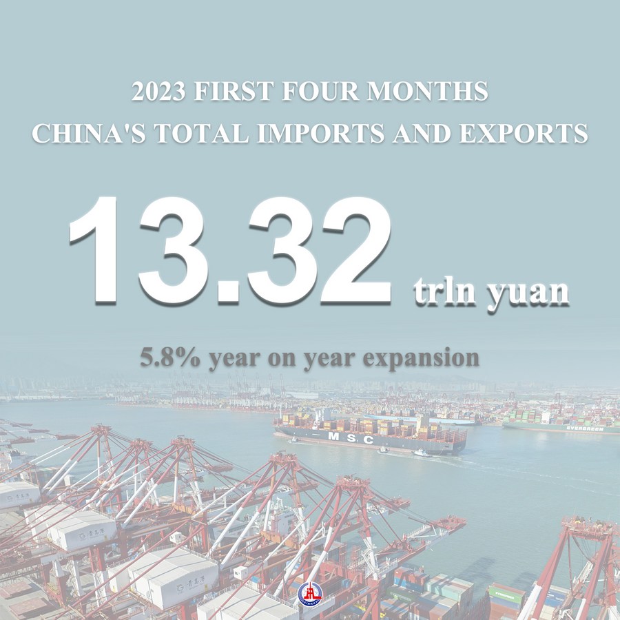 China's total imports and exports expanded 5.8 percent year on year to 13.32 trillion yuan in the first four months of 2023, official data showed Tuesday. (Xinhua)