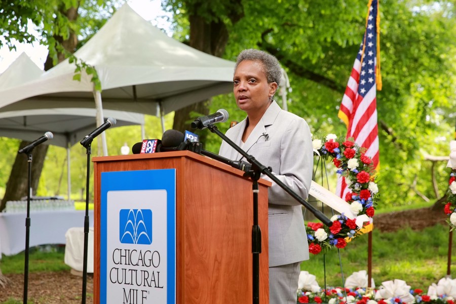 Chicago Mayor Lori Lightfoot speaks during a wreath-laying ceremony for Memorial Day in Chicago, the United States, on May 27, 2019. (Xinhua/Wang Ping)