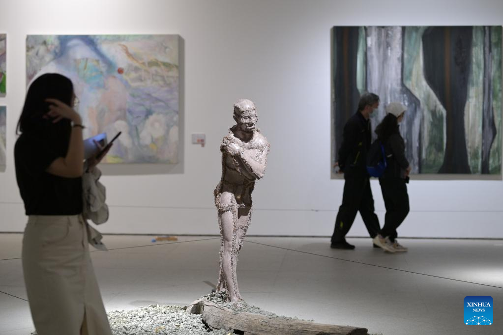 Visitors view sculptures at 2023 China Central Academy of Fine Arts (CAFA) postgraduate works exhibition in Beijing, capital of China, May 9, 2023. Over 3,000 pieces of postgraduate works were displayed in the exhibition, including paintings, sculptures, digital art, etc. (Xinhua/Yin Dongxun)