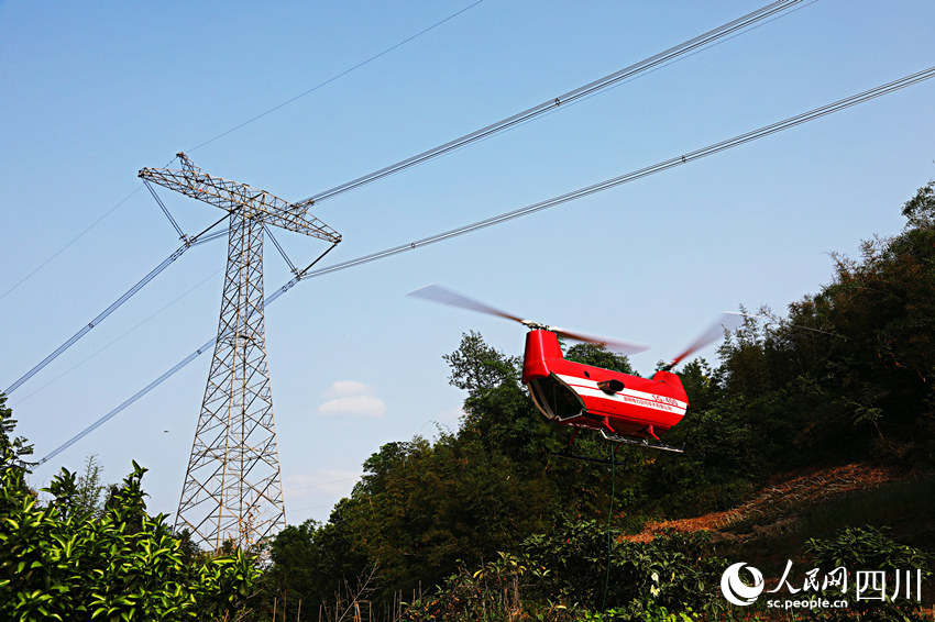 A dual-rotor heavy-lift unmanned helicopter carries materials to a high-voltage tower in Chatangzi village, Naxi district, Luzhou city, southwest China's Sichuan Province, during the annual inspection and maintenance of an 800-kilovolt ultra-high voltage (UHV) direct current power transmission line. (Photo/Wang Zhiqi)