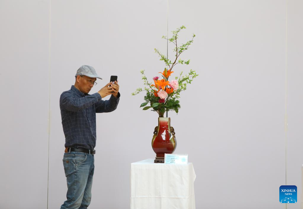 A visitor takes photos of a flower arrangement artwork at the Liaoning Agricultural Technical College in Shenyang, northeast China's Liaoning Province, May 10, 2023. Teachers and professionals in gardening and floriculture presented flower arrangement artworks at the Liaoning Agricultural Technical College on Wednesday. (Xinhua/Chen Wei)