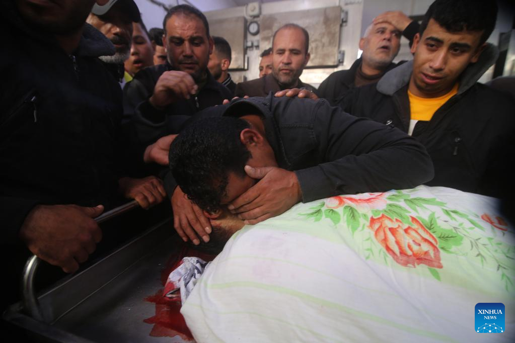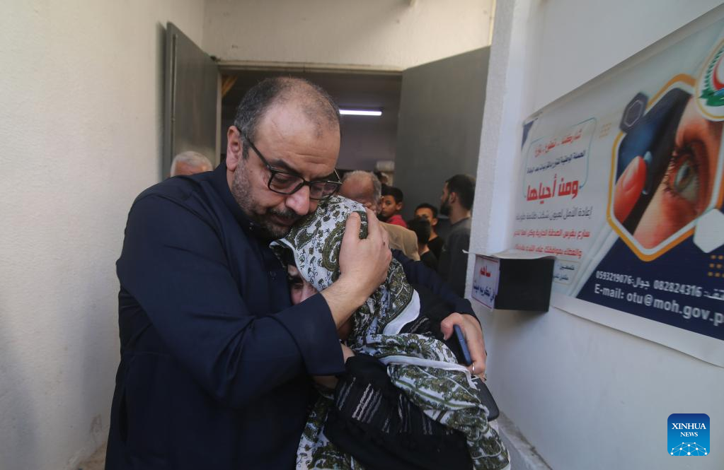 Palestinians mourn at a hospital in the southern Gaza Strip city of Rafah, on May 10, 2023. At least 21 Palestinians were killed and 64 were injured in the continuing Israeli airstrikes on the Gaza Strip, said the Palestinian Health Ministry in Gaza on Wednesday. (Photo by Khaled Omar/Xinhua)