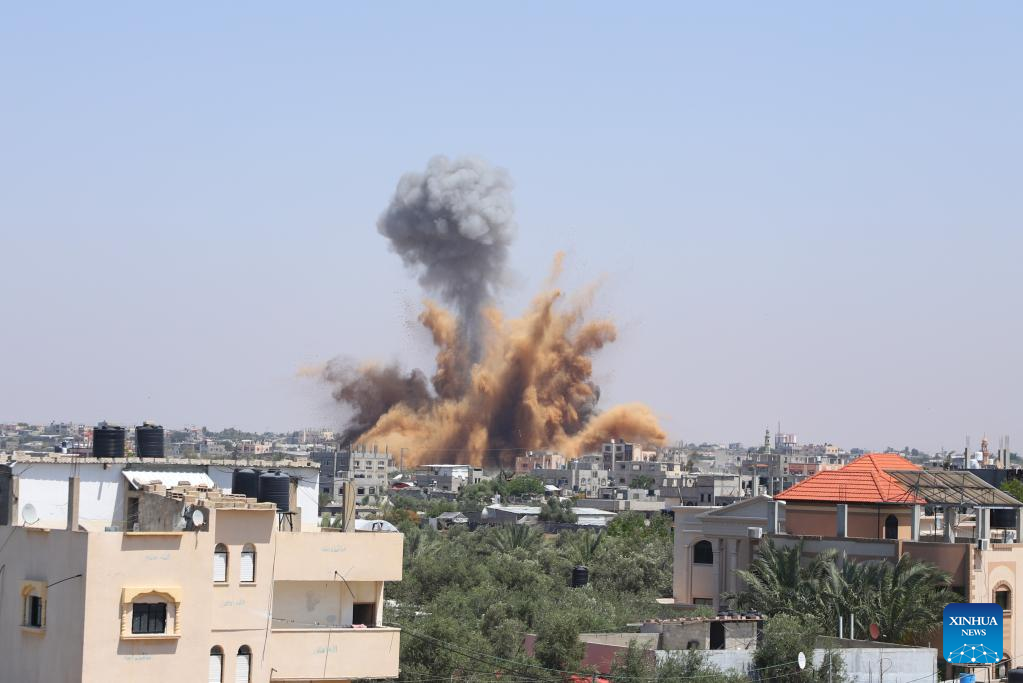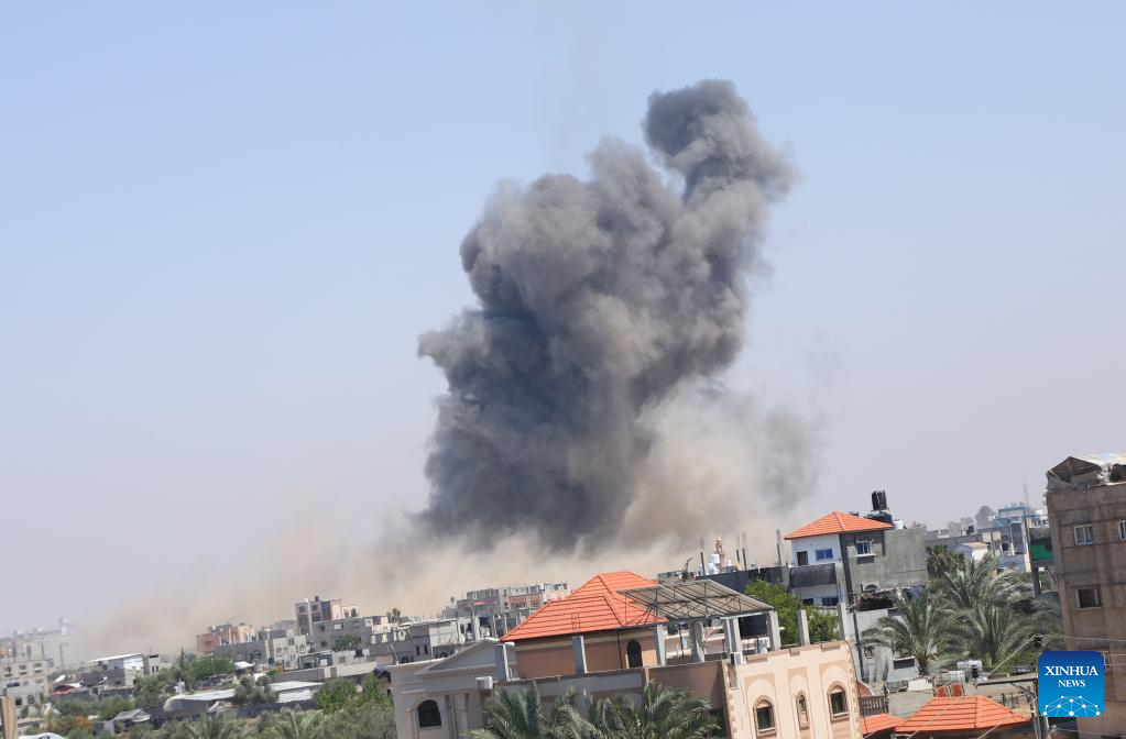 Smoke rises following an Israeli airstrike in the southern Gaza Strip city of Rafah, on May 10, 2023. At least 21 Palestinians were killed and 64 were injured in the continuing Israeli airstrikes on the Gaza Strip, said the Palestinian Health Ministry in Gaza on Wednesday. (Photo by Khaled Omar/Xinhua)