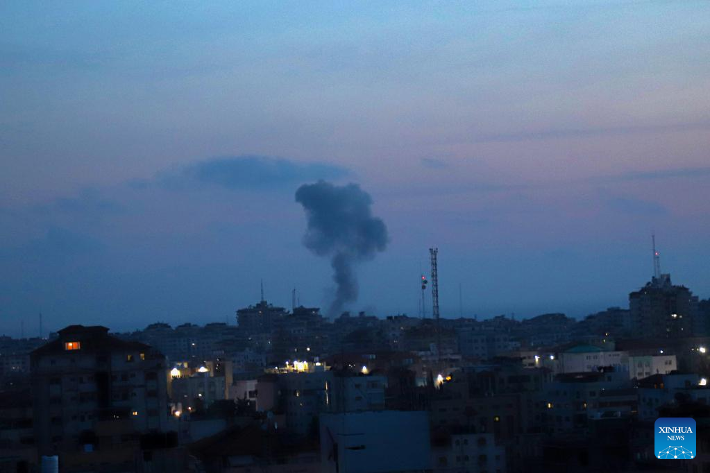 Smoke rises following an Israeli airstrike in Gaza City, on May 10, 2023. At least 21 Palestinians were killed and 64 were injured in the continuing Israeli airstrikes on the Gaza Strip, said the Palestinian Health Ministry in Gaza on Wednesday. (Photo by Rizek Abdeljawad/Xinhua)