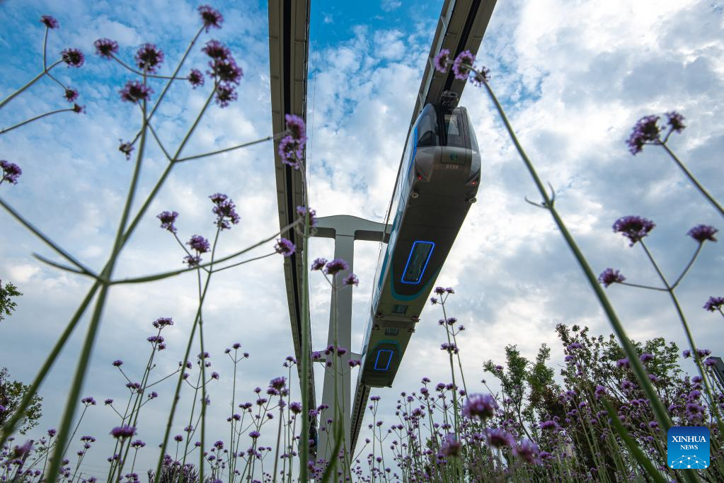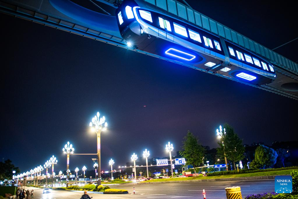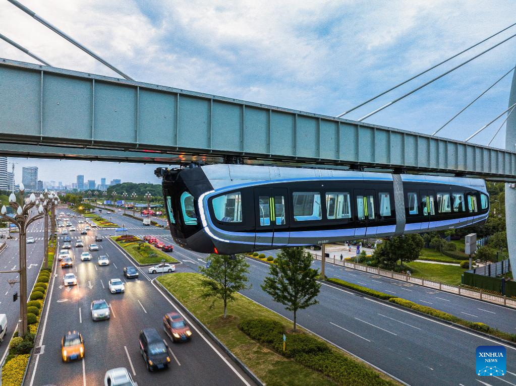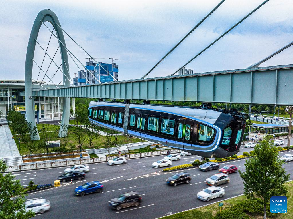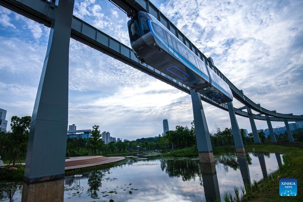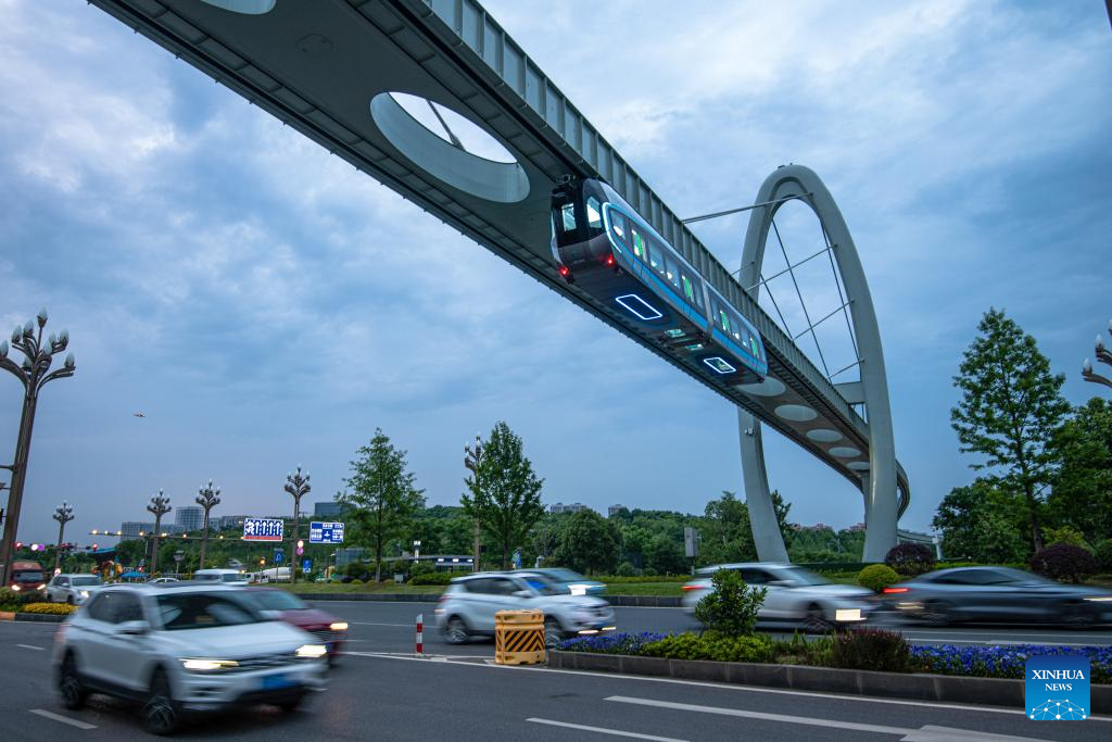 This photo taken on May 9, 2023 shows a train running on the suspension monorail line in Wuhan, central China's Hubei Province. The suspension monorail line in Wuhan has undergone a running test before being put into trial operation. (Xinhua/Xiao Yijiu)