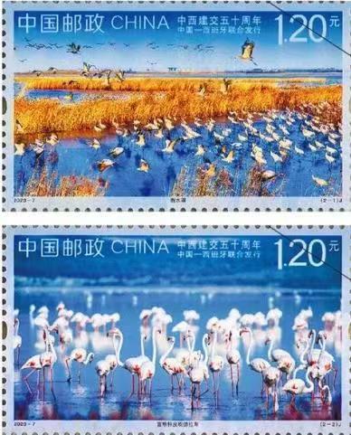 The stamps, featuring Spain's Laguna de Fuente de Piedra and the Hengshui Lake in north China's Hebei Province, were designed by Chinese stamp designer Ma Lihang.