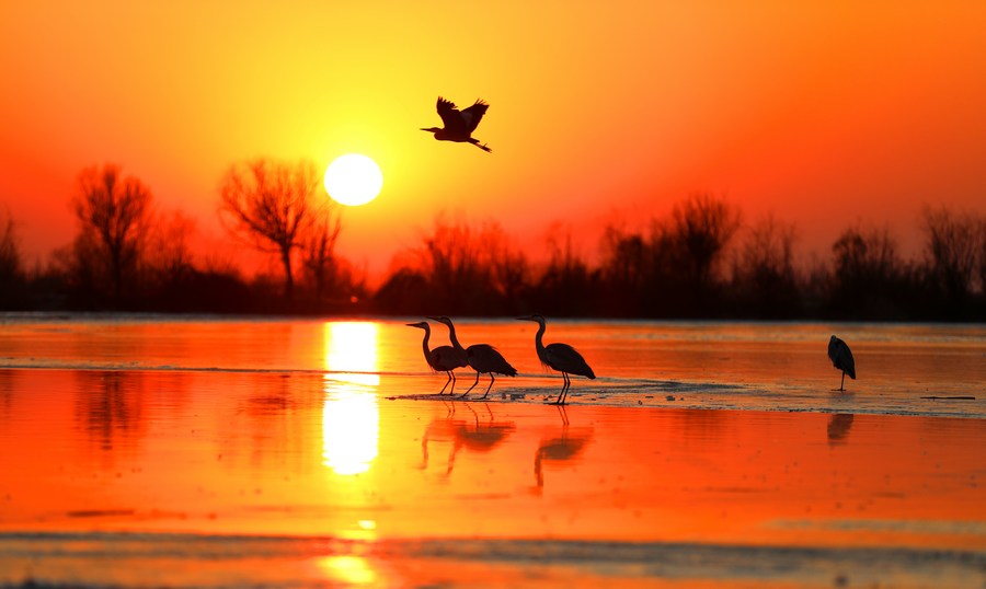 This file photo taken on Dec. 29, 2022 shows a sunset view of the Hengshui Lake in north China's Hebei Province. (Photo by Wang Tieliang/Xinhua)