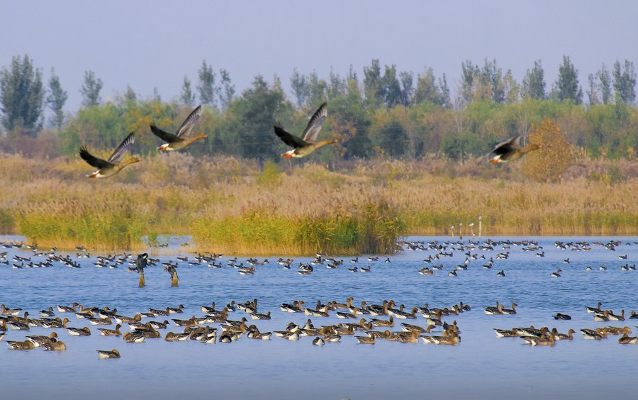 Birds rest at the Hengshui Lake in north China's Hebei Province, Oct. 28, 2022. (Photo by Wang Tieliang/Xinhua)