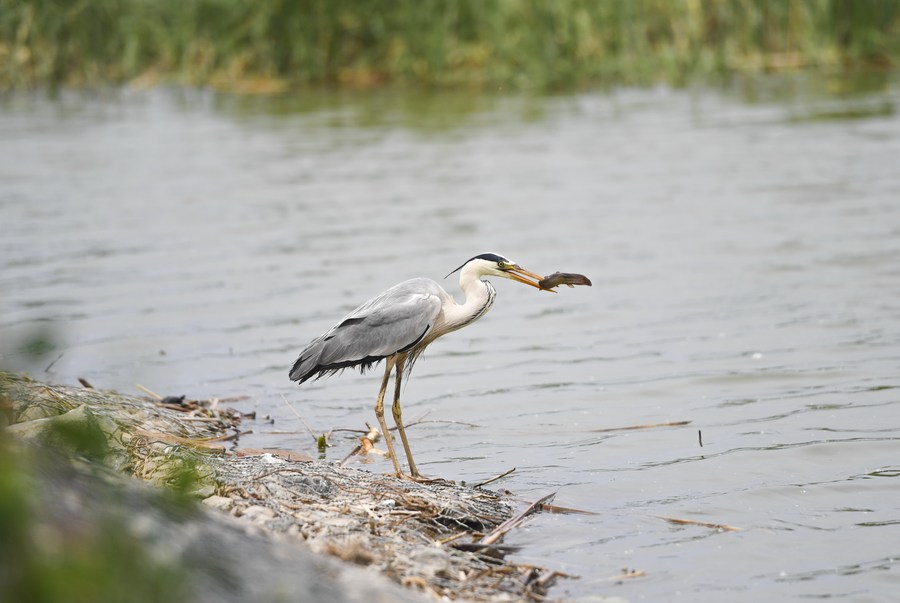 A heron forages near the Hengshui Lake in north China's Hebei Province, May 6, 2023. (Xinhua/Mu Yu)