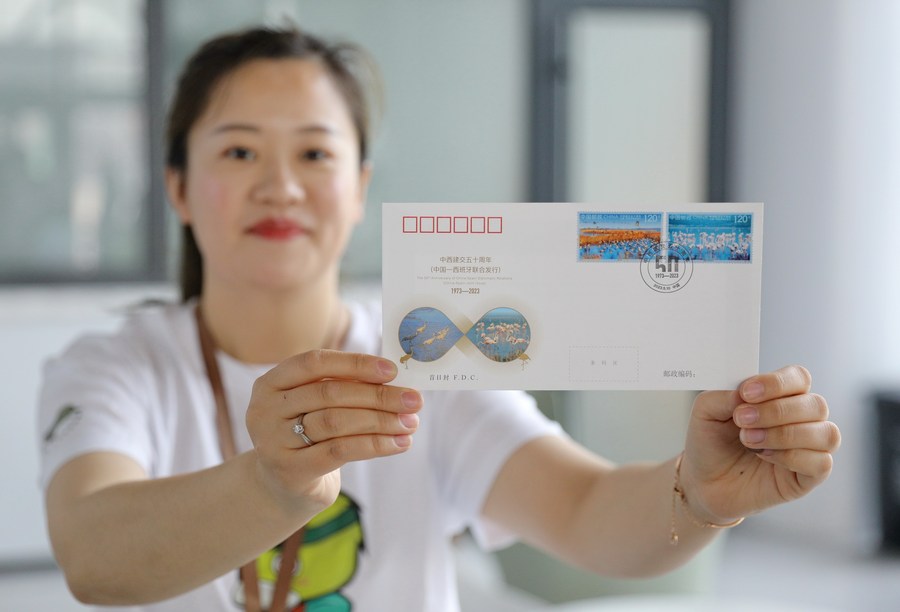 A postal staff member displays a first day cover with the stamps marking the 50th anniversary of the establishment of diplomatic relations between China and Spain in Hengshui, north China's Hebei Province, May 10, 2023. (Xinhua)